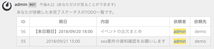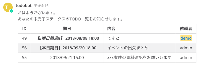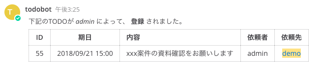 上記コマンドを打つと、@demoさん宛に、TODOの登録があったことが通知されます。