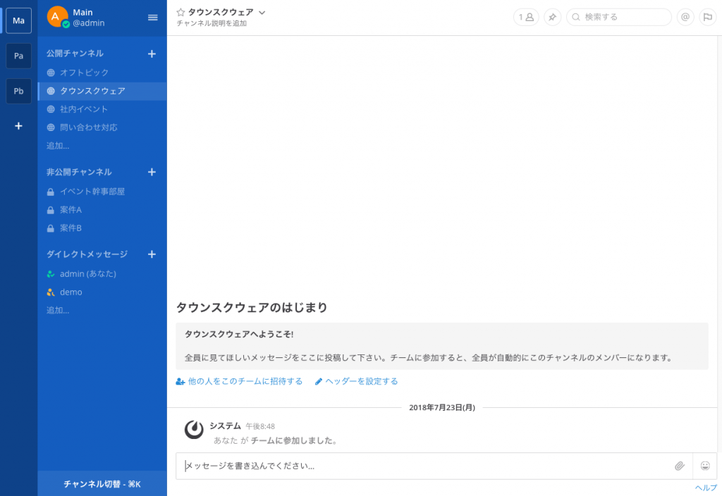 上記スクリーンショットが、Mattermostにログイン後の画面です。