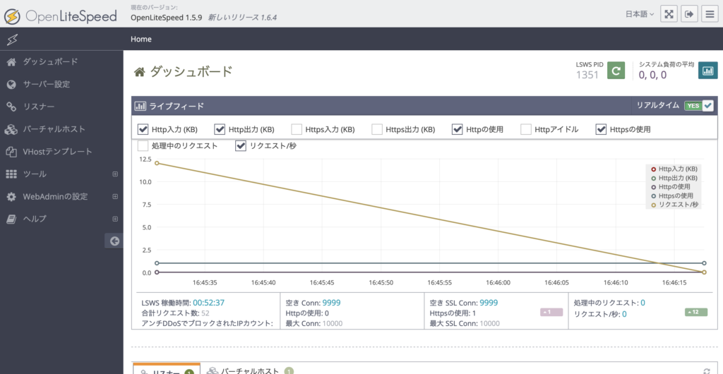 OpenLiteSpeedの設定は、前述の通りブラウザからアクセス可能なWebAdmin管理画面が用意されています。