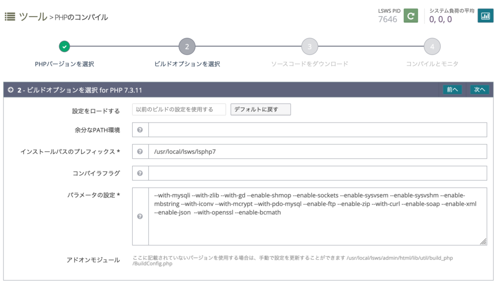 4ステップでPHPのコンパイルオプション等を指定したインストールスクリプトを生成できます。