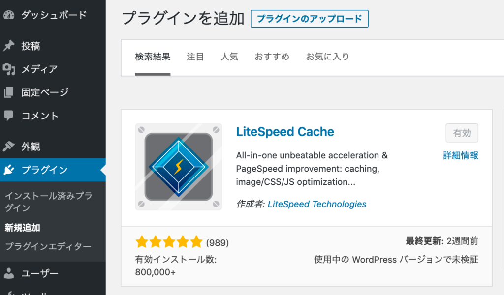 WordPressのインストールが完了したら、LiteSpeedでのWordPress高速化の恩恵を受けるため、「LiteSpeed Cache」プラグインをインストールします。